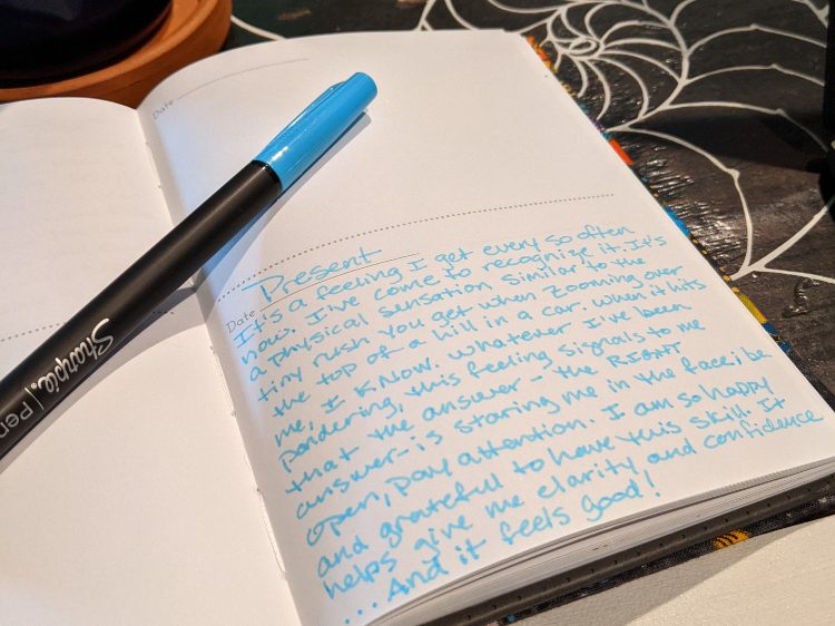 Each page is divided into two sections, with a blank for writing the date. Each time, in place of an actual date, I write “Present”, as if all of those things are already happening. (And once in a while, they are!) The size of each section helps me to keep my entries short. My subject matter runs the entire spectrum, from the minutia of observing small things in nature (the way spring peeper frogs sound on a warm April evening) to the existential (contemplating the ability to recognize signs from the Universe). The common thread in all my entries is that they are full of that belly flip-flop feeling of overwhelming joy…the kind that makes me do a happy dance like Lucy in the parking lot of the Hukilau Cafe.