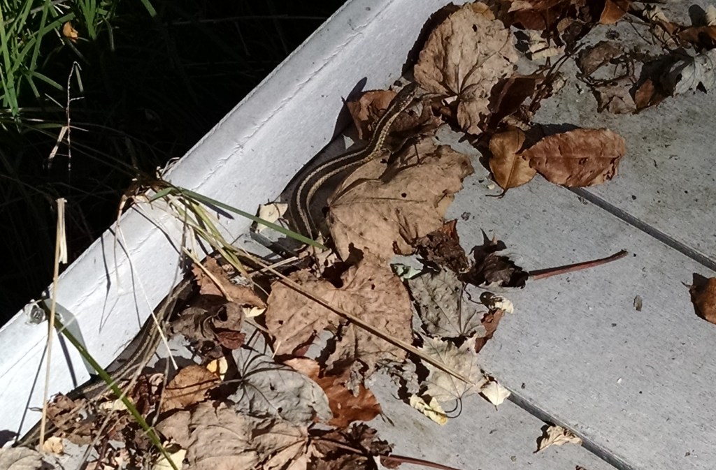 I listen to all the birds calling and singing. And not just as a whole, but I try to identify as many as I can. I pay attention to all the plants that are growing along the path. But I also take notice of what stage the plants are in. What drew my attention to the seed heads above was that they reminded me of the wisps in Disney/Pixar’s Brave. I notice the muddy footprints of the local animals that step up onto the boardwalk and use it briefly on their way to whatever it is that they are headed to do. I take in the scents of the flowers in the summer or that unmistakable autumn smell of dried grasses, overripe fallen apples and of the leaves becoming rich soil on the forest floor. I even found this little guy one day. He never moved.